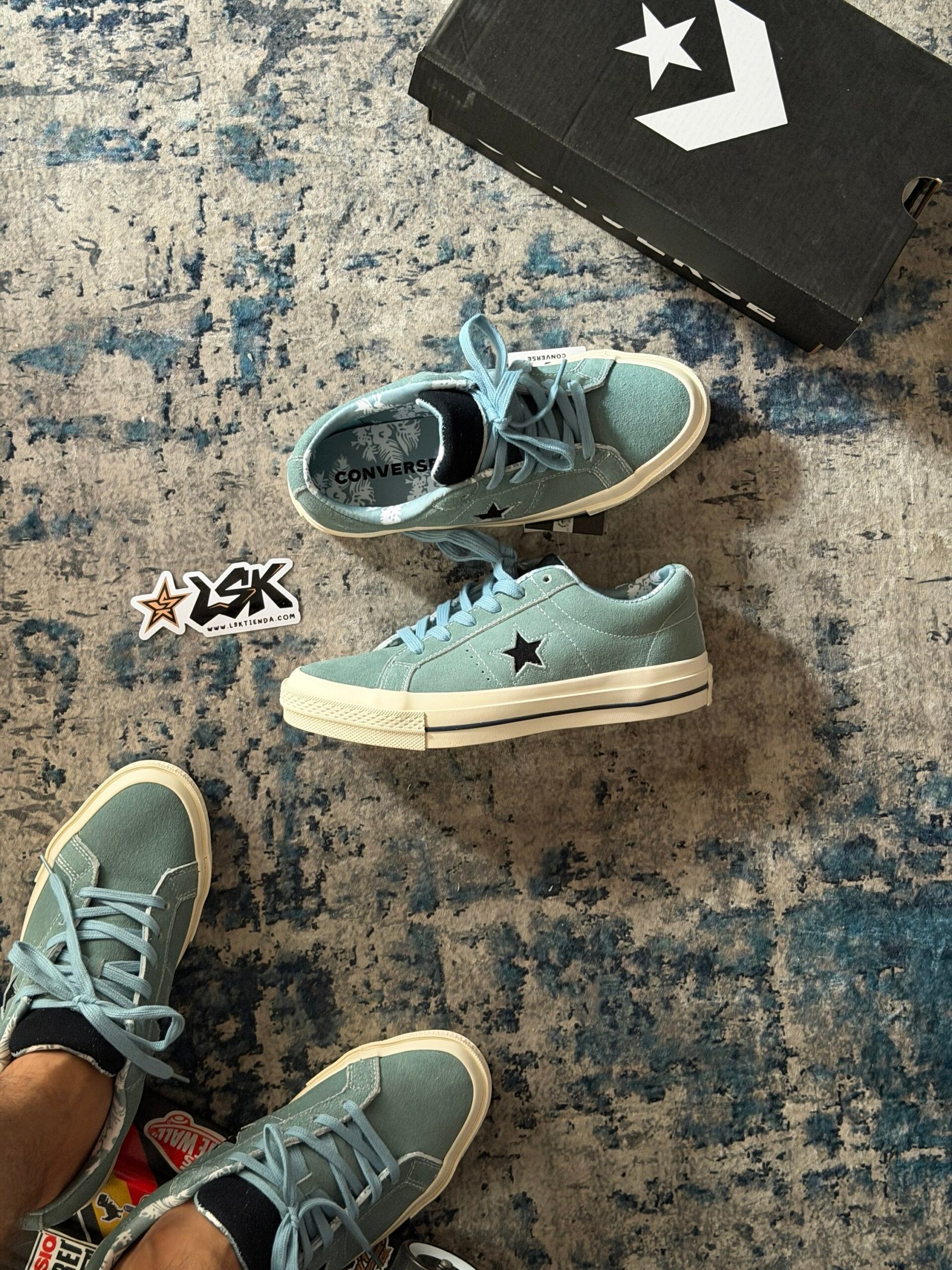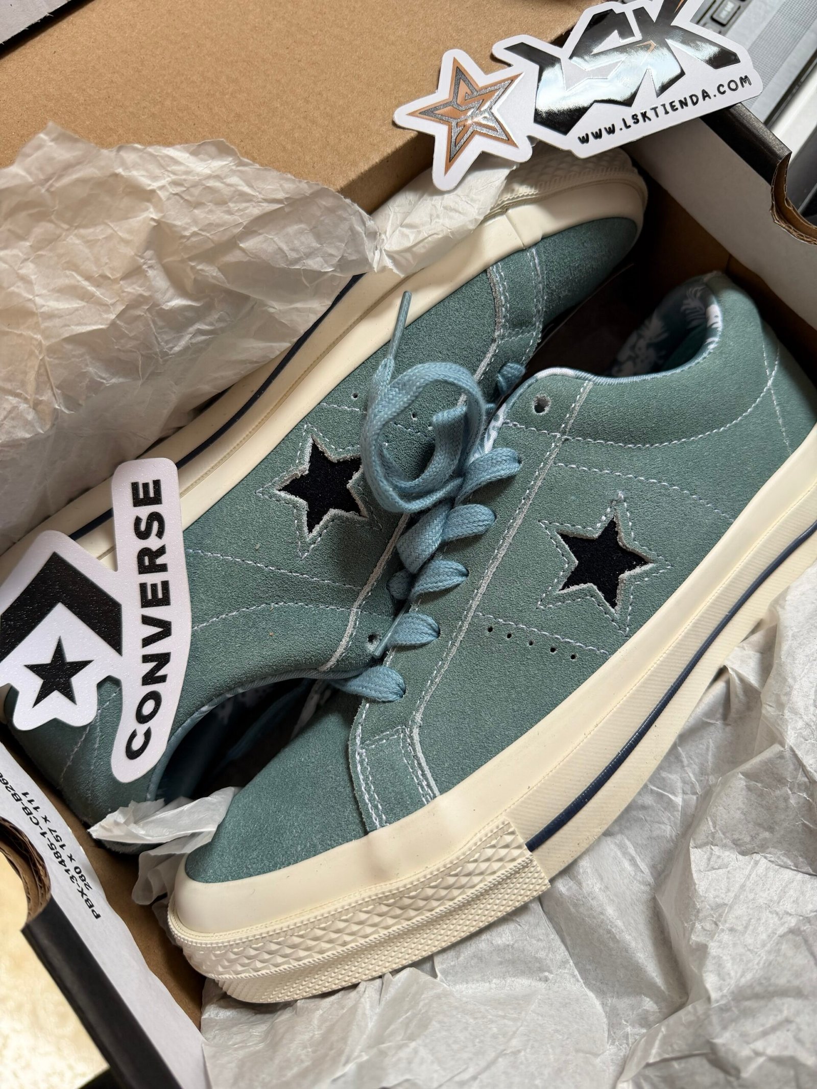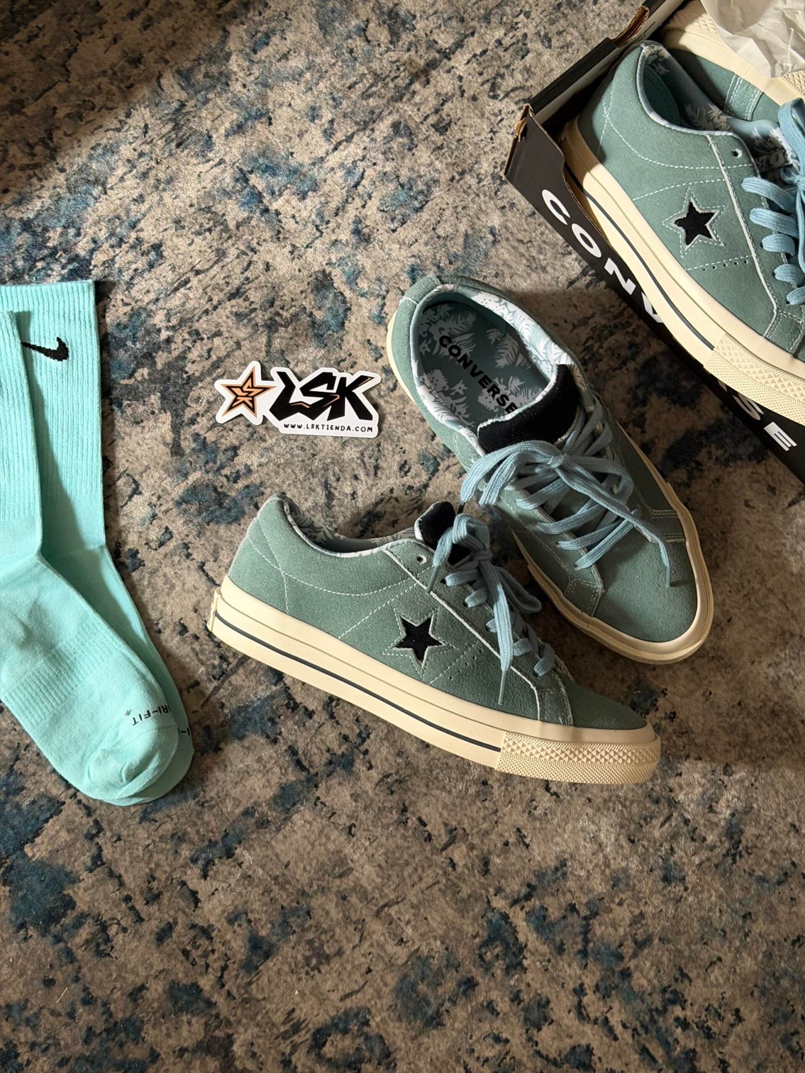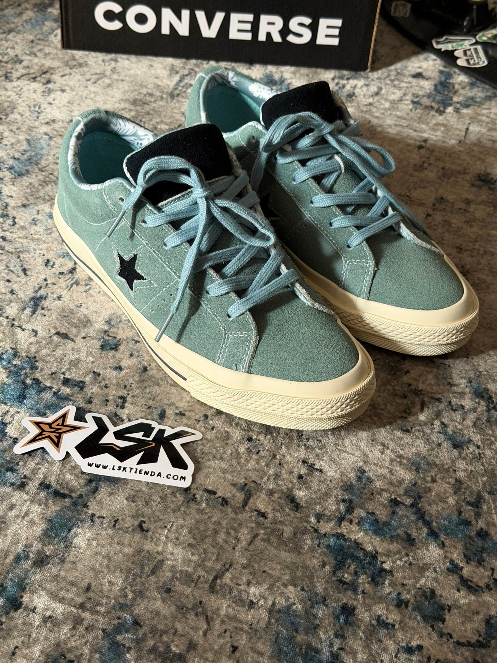Esta versión en color Aquamarina mantiene toda su esencia clásica con una capellada de gamuza premium, costuras visibles y la estrella lateral blanca que las distingue. Su suela de goma color cafe ofrece agarre y durabilidad, mientras que el interior acolchado garantiza comodidad en cada paso.