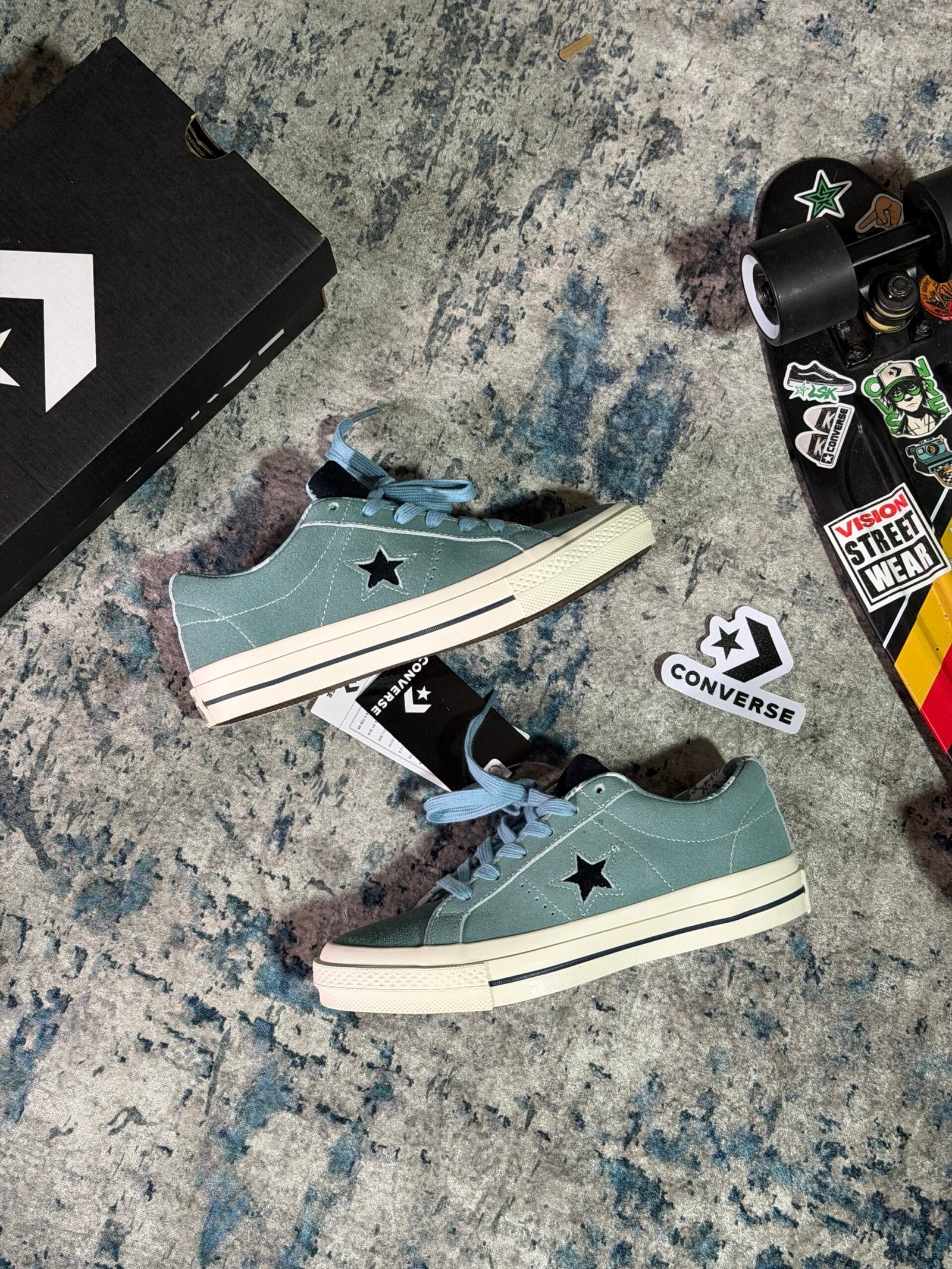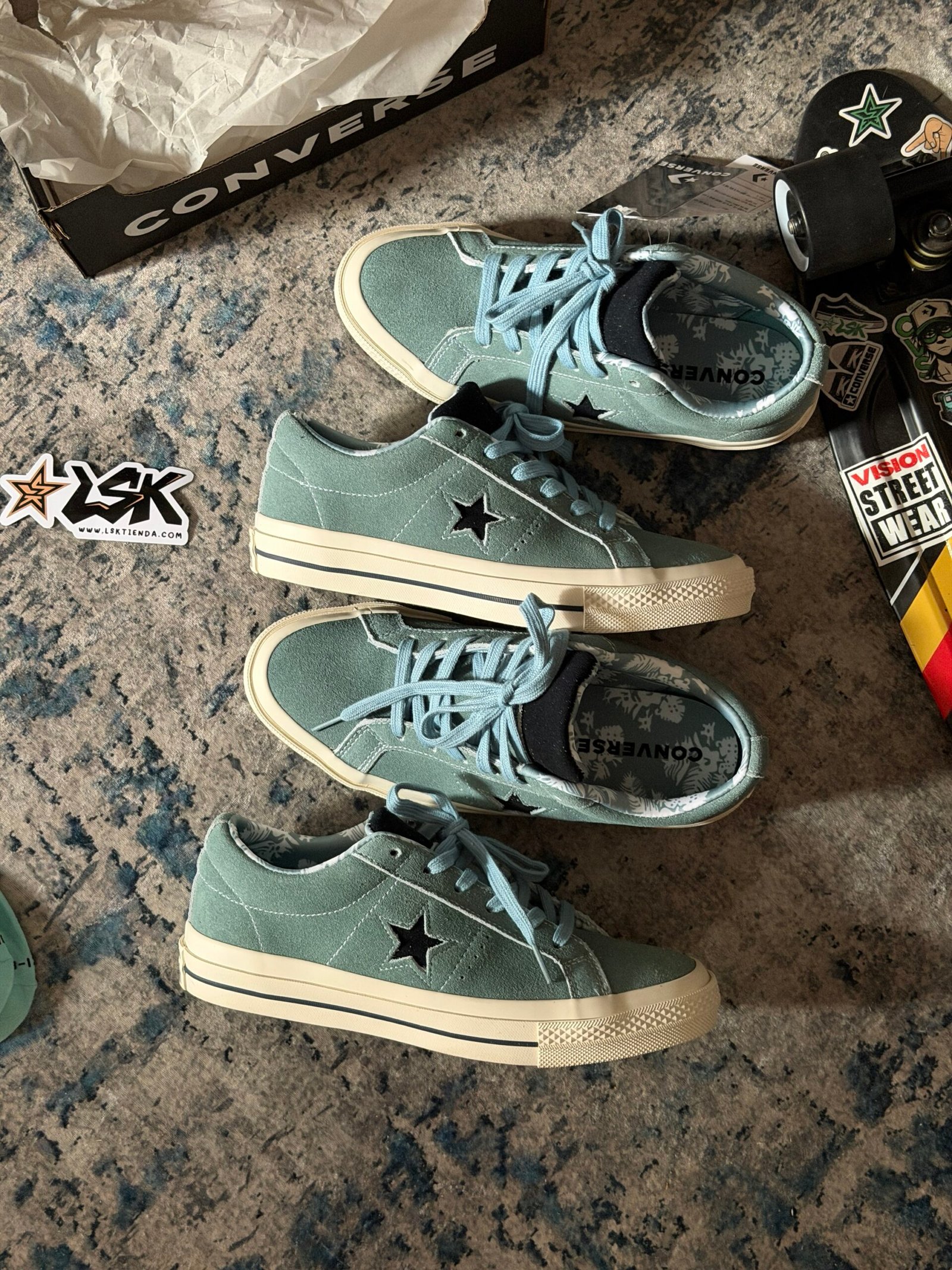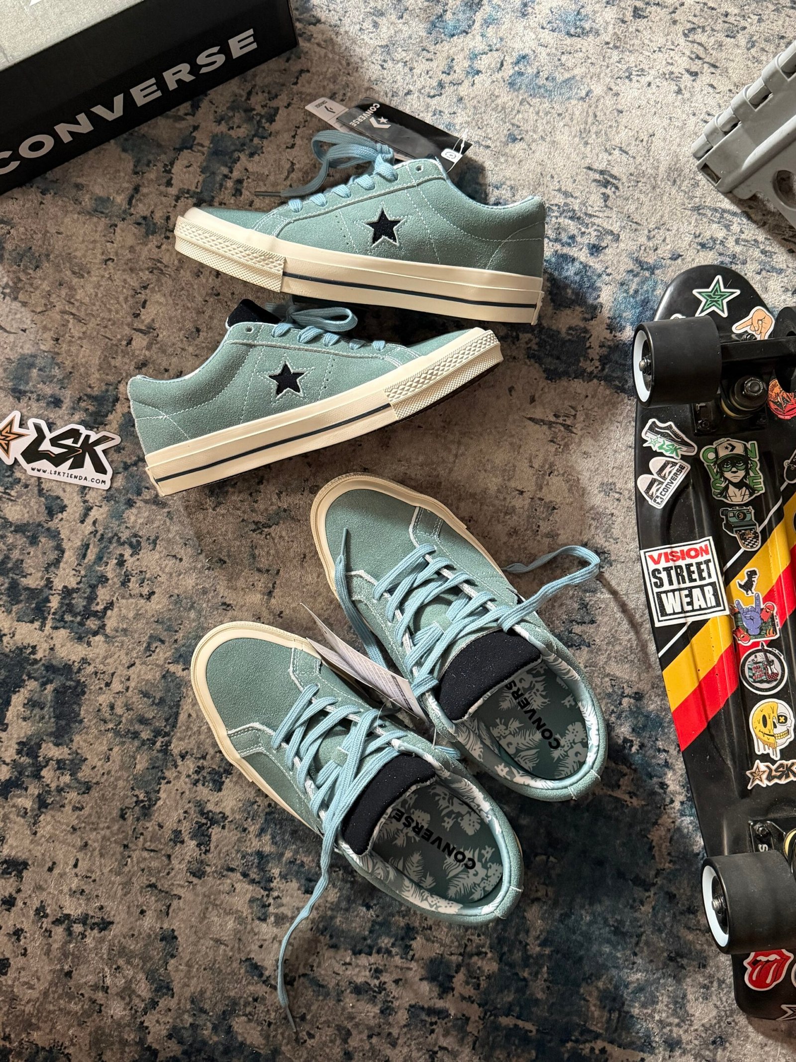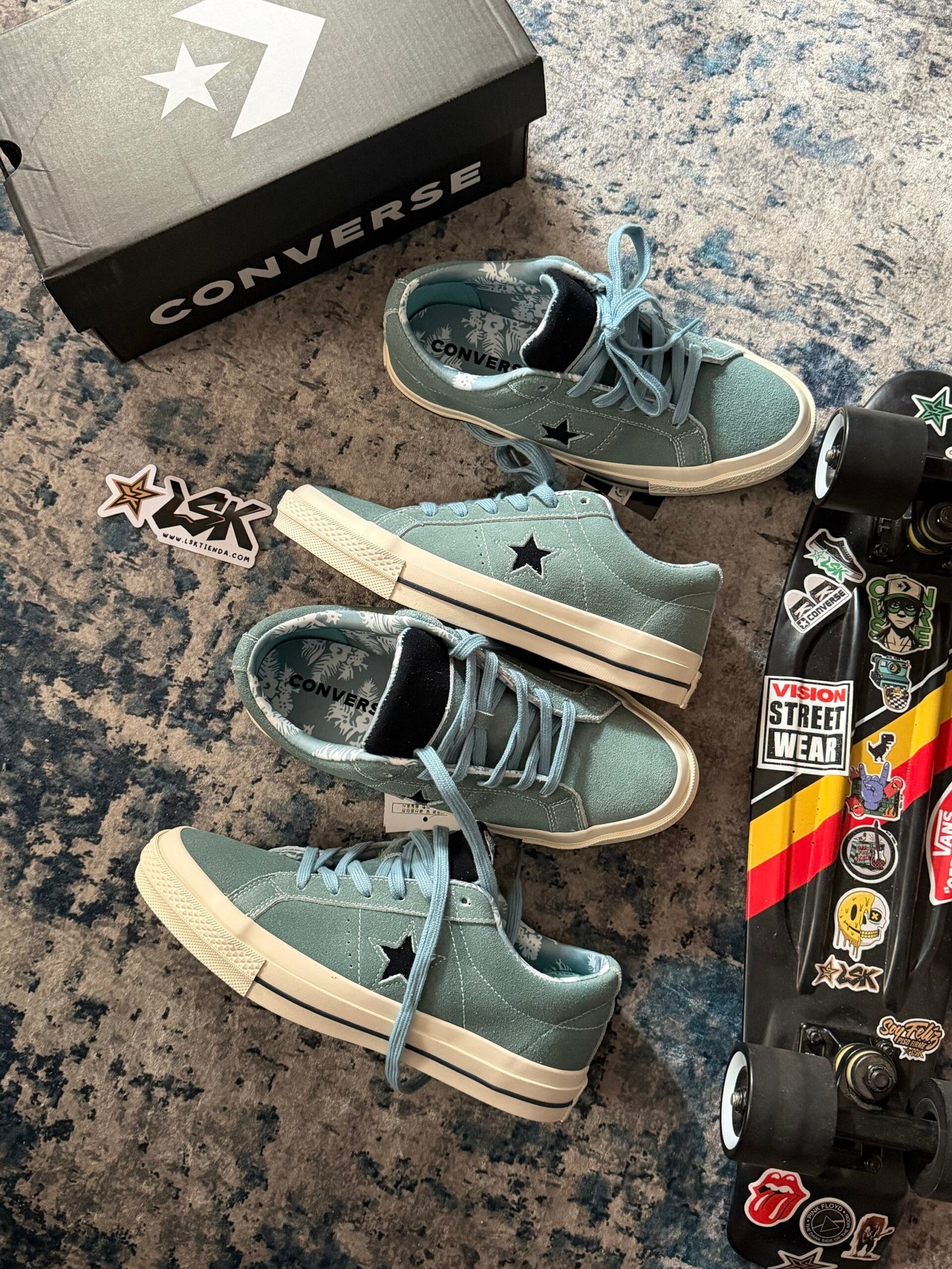 Esta versión en color Aquamarina mantiene toda su esencia clásica con una capellada de gamuza premium, costuras visibles y la estrella lateral blanca que las distingue. Su suela de goma color cafe ofrece agarre y durabilidad, mientras que el interior acolchado garantiza comodidad en cada paso.