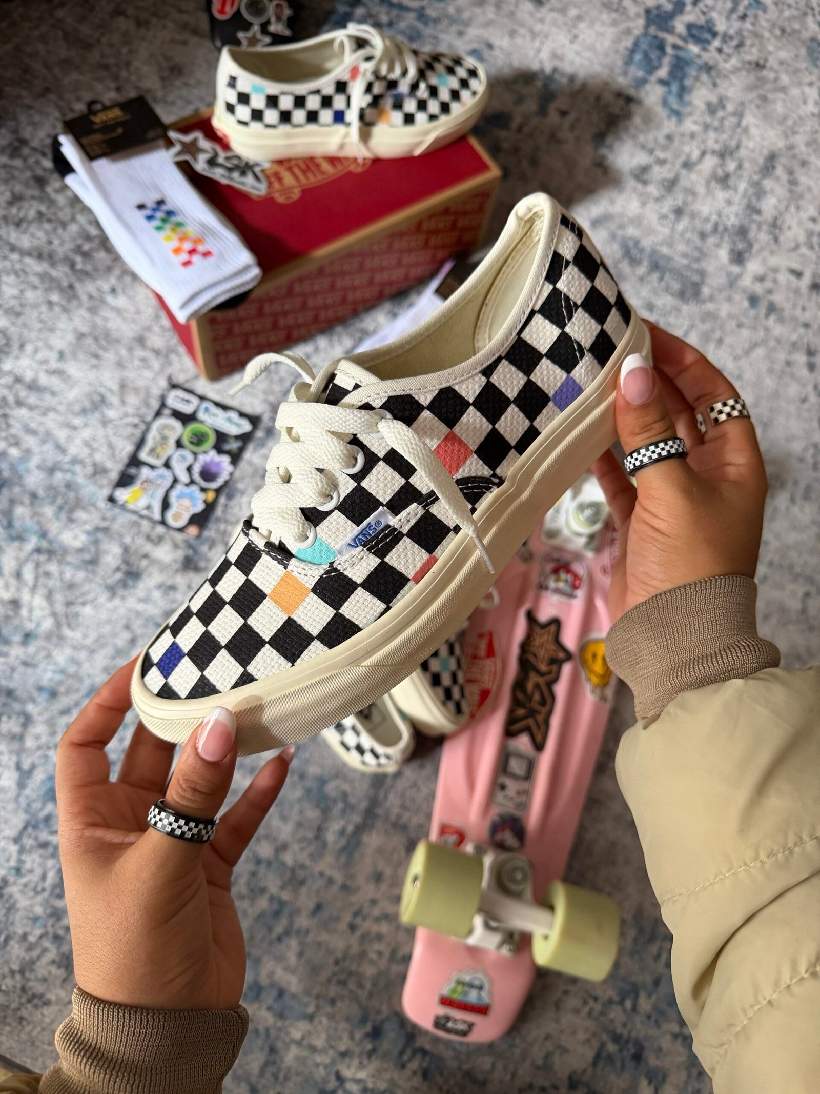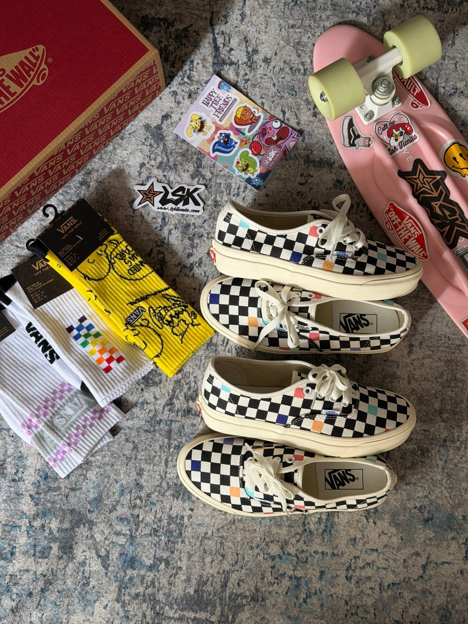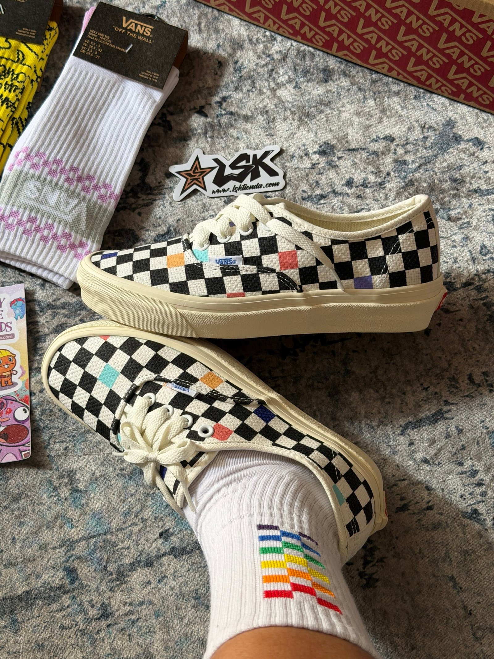 Su capellada presenta el icónico patrón checkerboard blanco y negro, acompañado de detalles de color distribuidos en el diseño, creando un contraste moderno que mantiene la esencia skate de Vans.